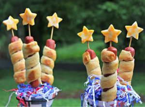 - Firecracker Hot Dogs from KickingItWithKelly.com – These Firecracker hot dogs are so easy! Display them in a red, white and blue bucket. Glue some Styrofoam in the bottom and the skewer sticks will stand up like bottle rockets! I found my mini cookie cutter for the cheese at Wal-mart for only $4.36. Find the recipe here.